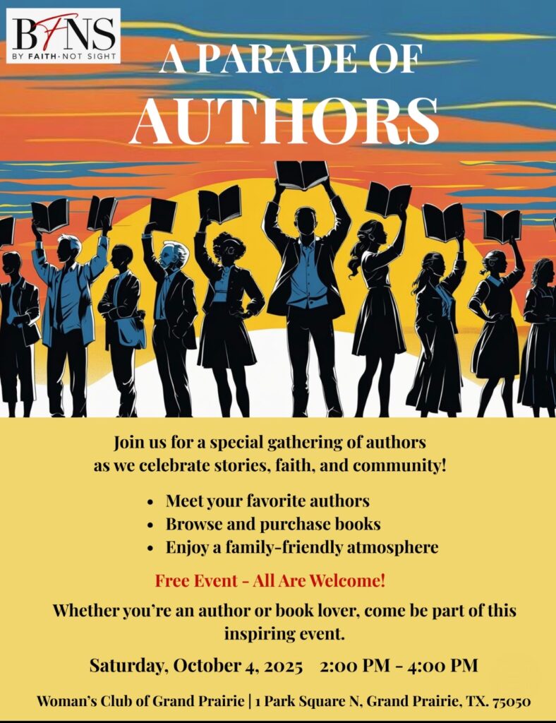 Join us on Saturday, October 4th from 2:00pm to 4:00pm at the Woman’s Club of Grand Prairie located at 1 Park Square N in Grand Prairie, Texas. This will be a special gathering of authors as we celebrate stories, faith, and community! Come out to: